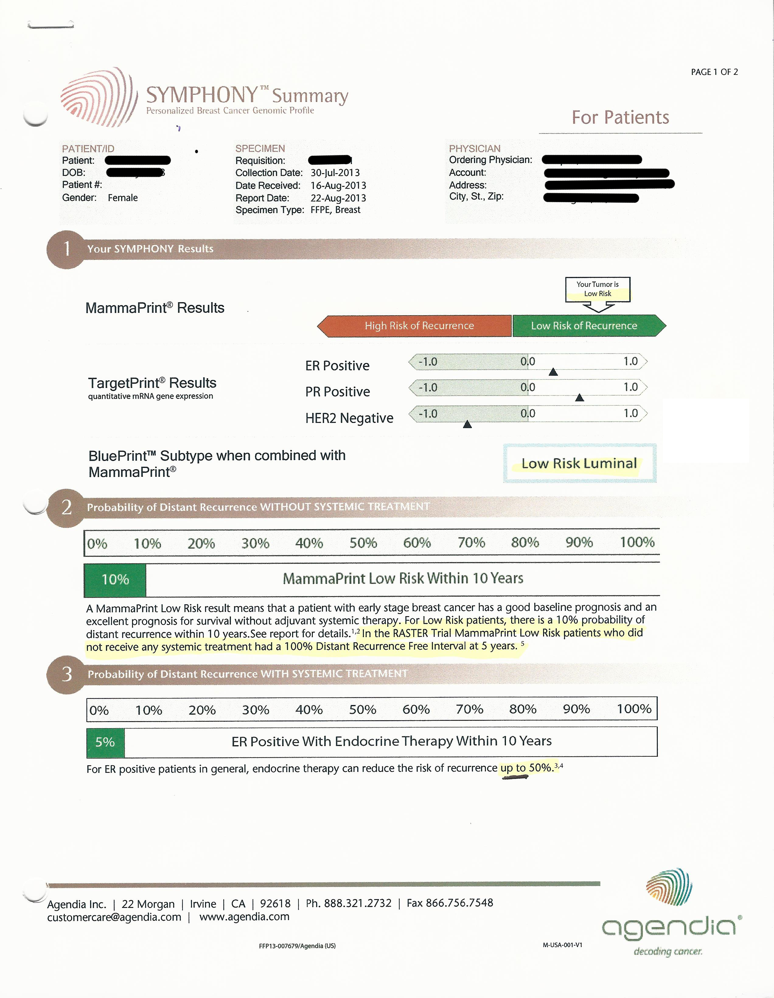Two weeks later, the Oncotype DX results came in – Low Risk 5%!!! It absolutely confirmed what the Mammaprint said.